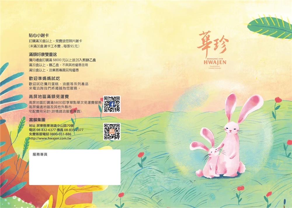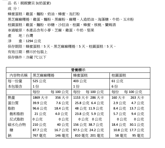 蜂蜜蛋糕1條、黑芝麻麻糬捲1條、桂圓蛋糕6入。 •歡迎來電洽詢 預購商品,請聯繫相關業務或門市 專線08-832-6377 line客服 ID: @gnj6281c (東港華珍食品) 每一禮盒-附贈贈禮提袋X1 •彌月試吃:可至【彌月試吃留言板】線上申請